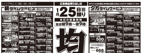 スーパーヤオスズのお買い得情報が満載のチラシをご覧いただけます。毎日のタイムサービス情報をはじめ、お野菜やお肉、お魚などの日替わりのお得な情報も掲載していますので、内容をご覧になり、スーパーヤオスズ各店鋪へご来店ください。 2026.01.30 更新 スーパーヤオスズ・3店舗別チラシ情報 2月1日(日)〜7日(土) 2026.01.23 更新 1月25日(日)〜1月31日(土) 新鮮で、安心、安全な食の提供、そして地域の皆さまの健康的な生活のお役に立てる店でありたいと願っています。 地元のお客様に頼りにされるスーパーマーケットであり続けるよう、日々努力してまいります。