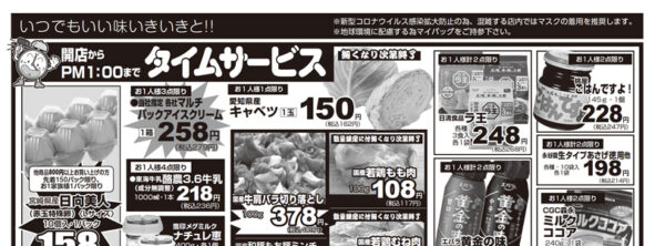 スーパーヤオスズのお買い得情報が満載のチラシをご覧いただけます。毎日のタイムサービス情報をはじめ、お野菜やお肉、お魚などの日替わりのお得な情報も掲載していますので、内容をご覧になり、スーパーヤオスズ各店鋪へご来店ください。 2026.02.13 更新 キララ店限定・2月15日(日)〜21日(土) 2026.02.06 更新 キララ店限定・2月8日(日)〜14日(土) 新鮮で、安心、安全な食の提供、そして地域の皆さまの健康的な生活のお役に立てる店でありたいと願っています。 地元のお客様に頼りにされるスーパーマーケットであり続けるよう、日々努力してまいります。