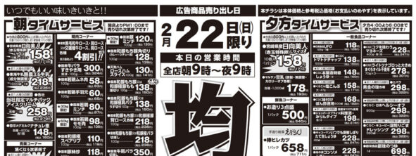 スーパーヤオスズのお買い得情報が満載のチラシをご覧いただけます。毎日のタイムサービス情報をはじめ、お野菜やお肉、お魚などの日替わりのお得な情報も掲載していますので、内容をご覧になり、スーパーヤオスズ各店鋪へご来店ください。 2026.02.20 更新 2月22日(日)〜28日(土) 2026.02.13 更新 キララ店限定・2月15日(日)〜21日(土) 新鮮で、安心、安全な食の提供、そして地域の皆さまの健康的な生活のお役に立てる店でありたいと願っています。 地元のお客様に頼りにされるスーパーマーケットであり続けるよう、日々努力してまいります。